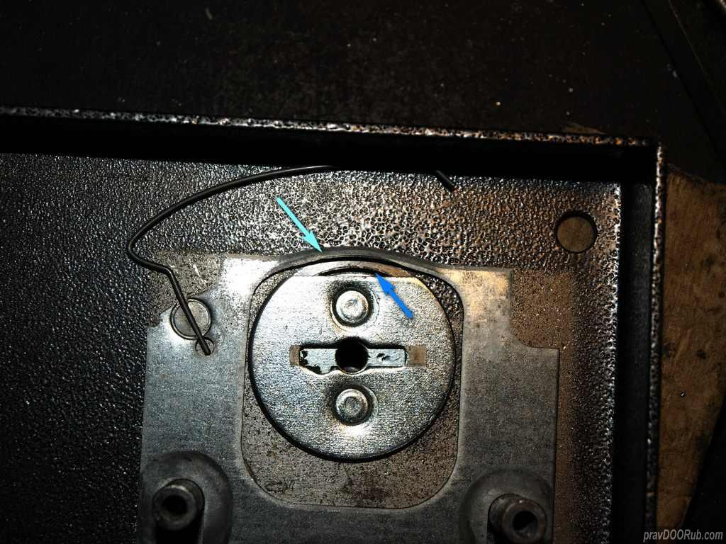 Со временем происходит износ и деформация опорной перемычки стопорной пластины (голубая стрелка), кромок отверстия в корпусе замка и кромок диска поворотной ручки (синяя стрелка). Замок на выброс  :es: , требуется замена корпуса, так как появляющиеся люфты постоянного (внутри корпуса) ключа не позволяют пользоваться замком изнутри помещения. Со стороны улицы замок продолжает работать штатно.